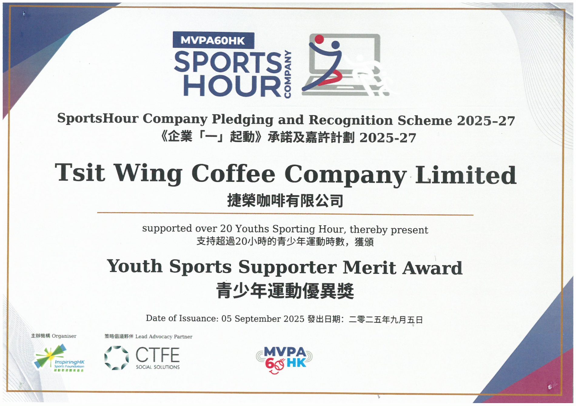 捷荣集团荣获凝动香港体育基金主办,计划目的以鼓励雇主及企业员工共同为香港社会建立活力企业圈及支持5至17岁的儿童及青少年运动,促进青少年在身体和心理上的健康发展。